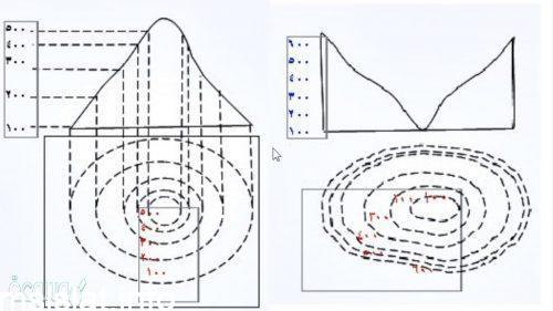في المناطق المرتفعة ، تتقارب الخطوط الكنتورية ، بسبب شدة الانحدار في المناطق المرتفعة ، كلما زاد التقارب يشير إلى شدة المنحدر.