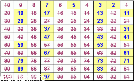 الأرقام الأولى من صفر إلى 100 هي: {2 ، 3 ، 5 ، 7 ، 11 ، 13 ، 17 ، 19 ، 23 ، 29 ، 31 ، 37 ، 41 ، 43 ، 47 ، 53 ، 59 ، 61 ، 67 ، 71 ، 73 ، 79 ، 83 ، 89 ، 97}